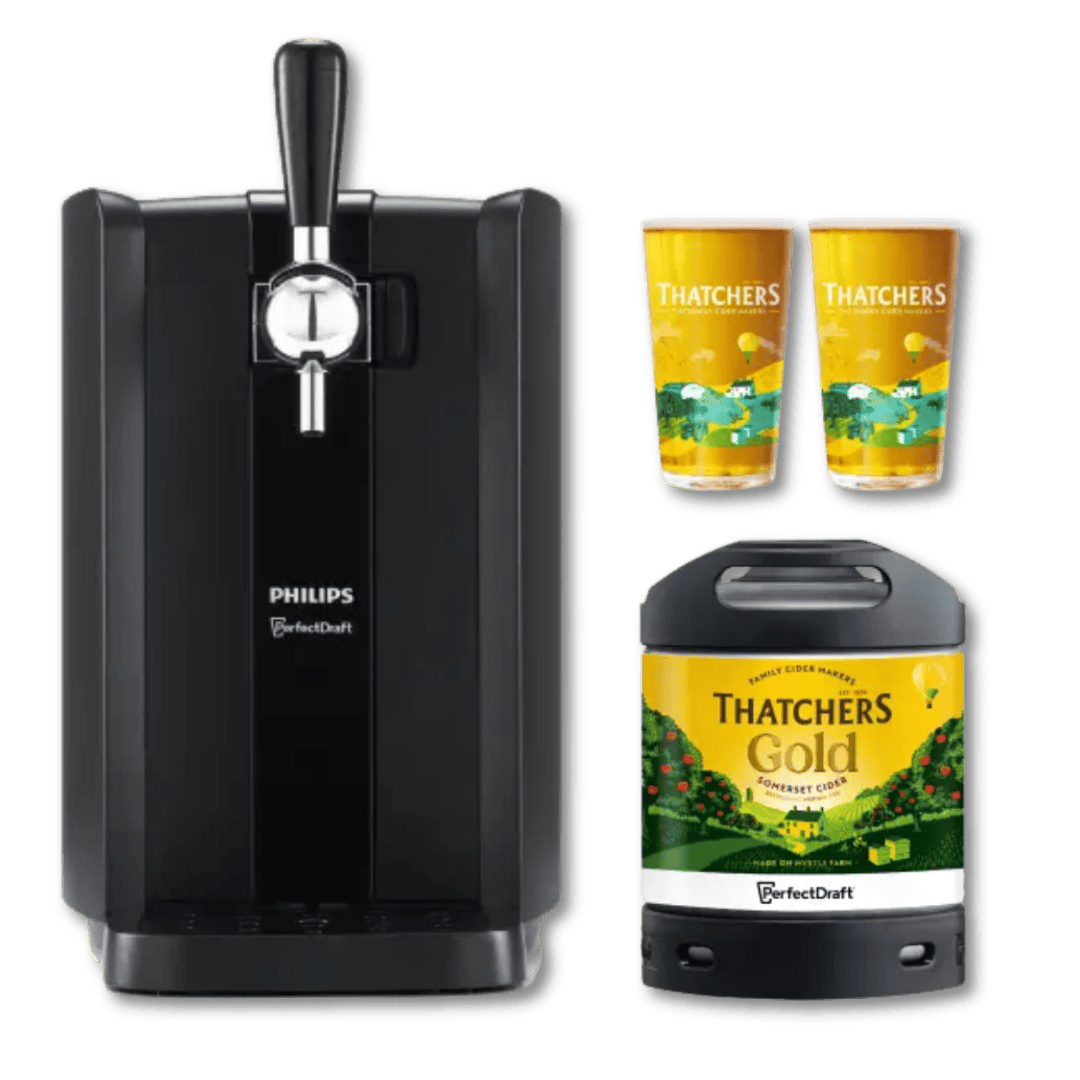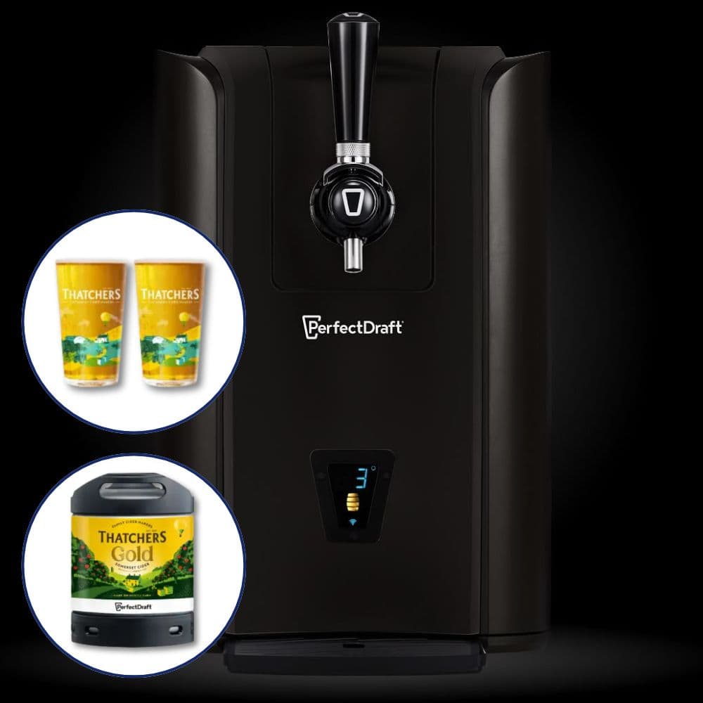 This starter bundle combines the PerfectDraft beer dispenser in black with a 6-litre keg of Thatchers Gold, providing a complete setup for enjoying draught beer and cider at home.