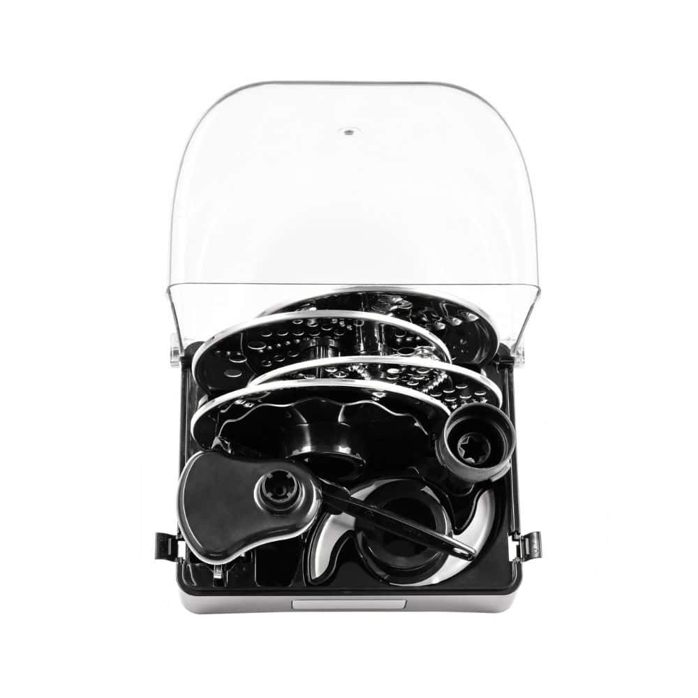 Key features include a high-performance 1300W motor and a generous 3 litre bowl capacity that is perfect for preparing large family meals or hosting dinner parties. The machine offers five intuitive modes for pulse, egg, dough, and chopping, alongside a dedicated auto clean function that helps wash the bowl at the touch of a button. It comes equipped with a comprehensive set of accessories, including two sharp bowl blades, an emulsifying disc, a whisk attachment, and four specialised slicing discs for grating, slicing, and julienne cutting. A wide feed tube with dual-sized food pushers allows you to add ingredients safely while the motor is running, and variable speed settings give you complete control over the texture of your ingredients. To keep your kitchen organised and safe, the set also includes a lockable storage box designed specifically to hold all the sharp blades and attachments in one place.