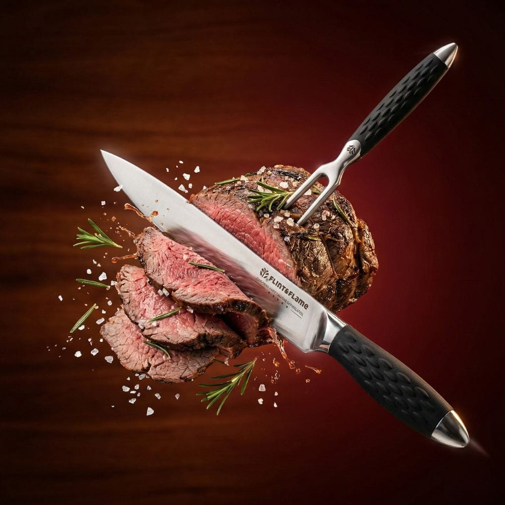 The Flint and Flame Pro Series Carving Set combines traditional craftsmanship with a modern ergonomic design to ensure every roast is served perfectly with minimal effort.