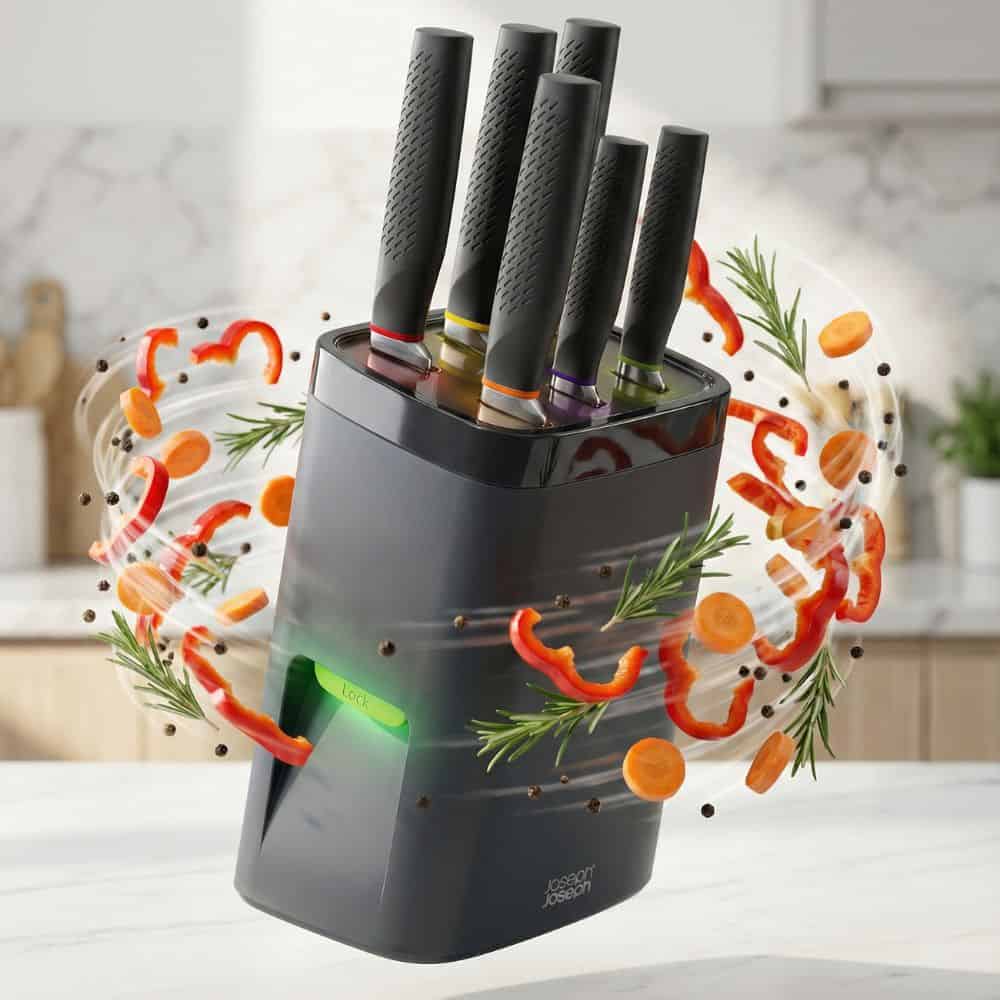The Joseph Joseph LockBlock 6-Piece Knife Block Set combines everyday practicality with a built-in safety mechanism, offering secure storage for six essential knives.
