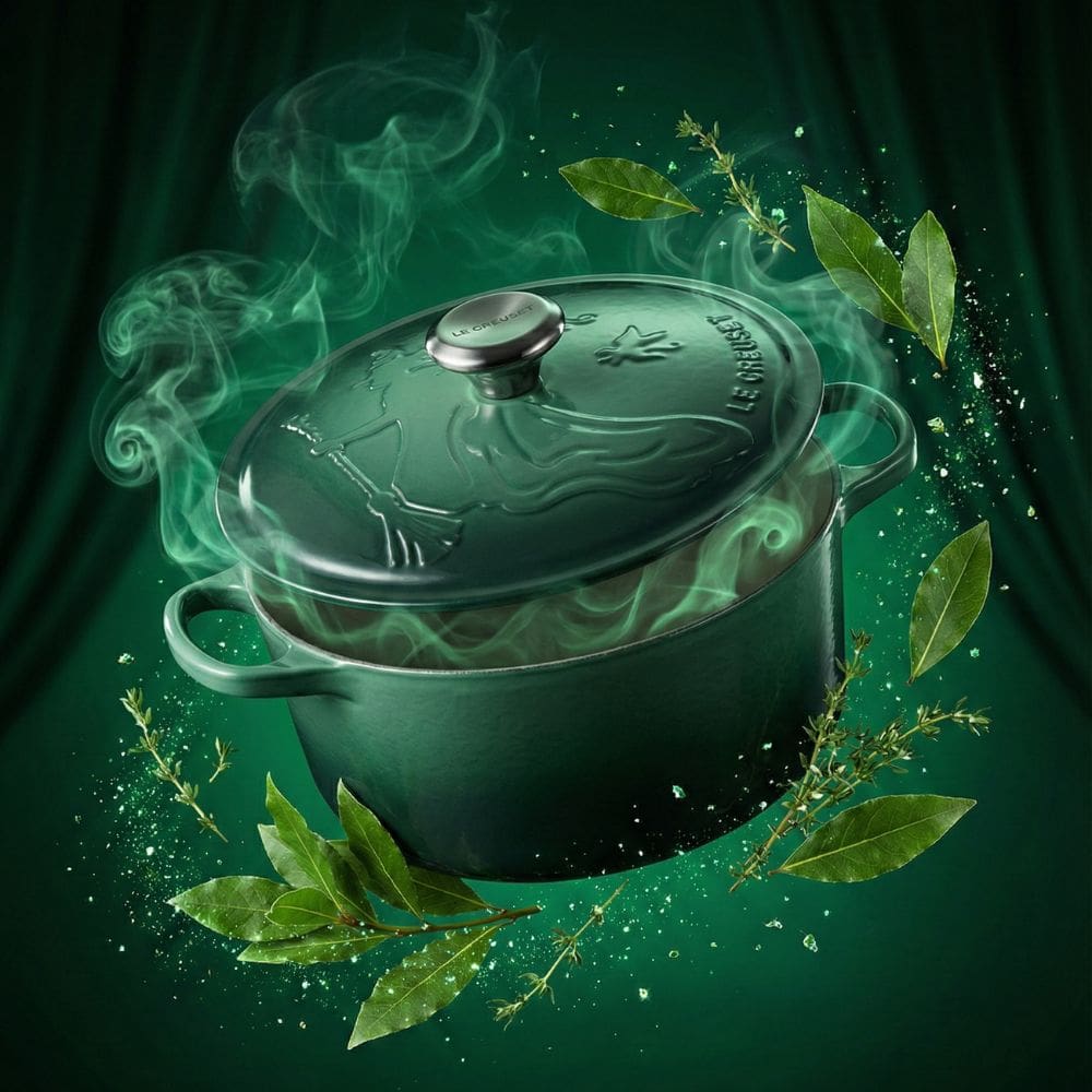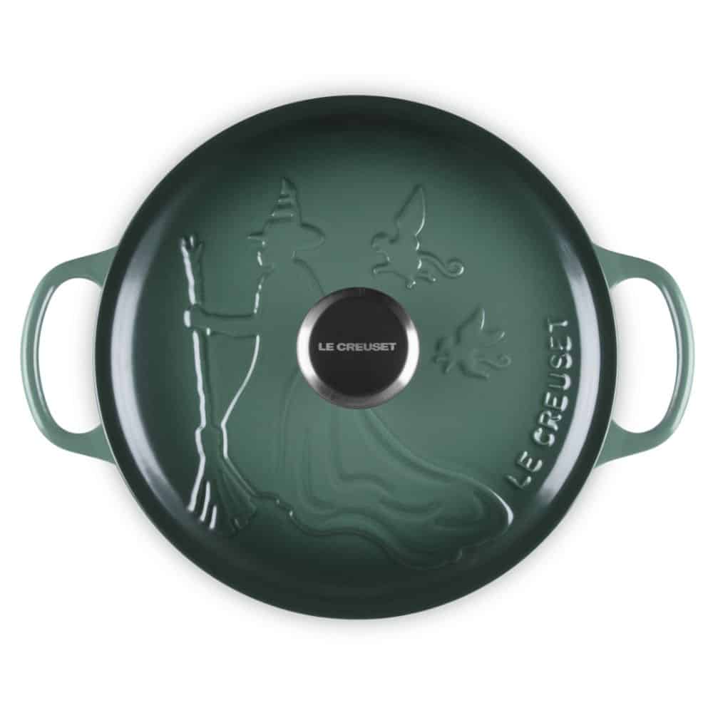 Cast a stylish spell over your stovetop with this limited-edition piece from the Le Creuset Wicked Collection. This 24cm (4.2L) round casserole is a tribute to Elphaba, finished in a deep, shimmering green enamel that perfectly captures the character’s iconic look. The lid is intricately embossed with her signature pointed hat and broomstick, while the matte black interior provides a striking contrast. Beyond its magical looks, this is a culinary workhorse; the heavy-duty enamelled cast iron provides the most even heat distribution and retention available, making it perfect for slow-cooking stews or baking sourdough. The oversized handles make it easy to move from hob to oven even with bulky oven gloves, and the unique black nickel knob adds a final touch of dark elegance.