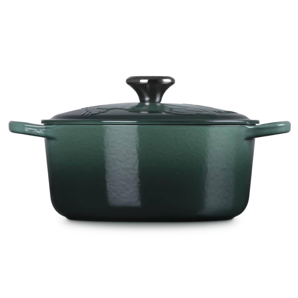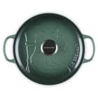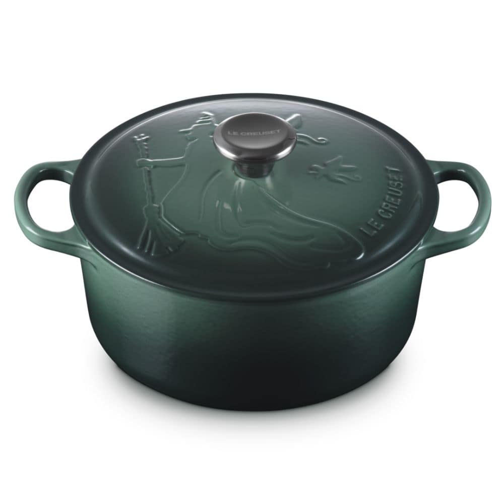Cast a stylish spell over your stovetop with this limited-edition piece from the Le Creuset Wicked Collection. This 24cm (4.2L) round casserole is a tribute to Elphaba, finished in a deep, shimmering green enamel that perfectly captures the character's iconic look. The lid is intricately embossed with her signature pointed hat and broomstick, while the matte black interior provides a striking contrast. Beyond its magical looks, this is a culinary workhorse; the heavy-duty enamelled cast iron provides the most even heat distribution and retention available, making it perfect for slow-cooking stews or baking sourdough. The oversized handles make it easy to move from hob to oven even with bulky oven gloves, and the unique black nickel knob adds a final touch of dark elegance.