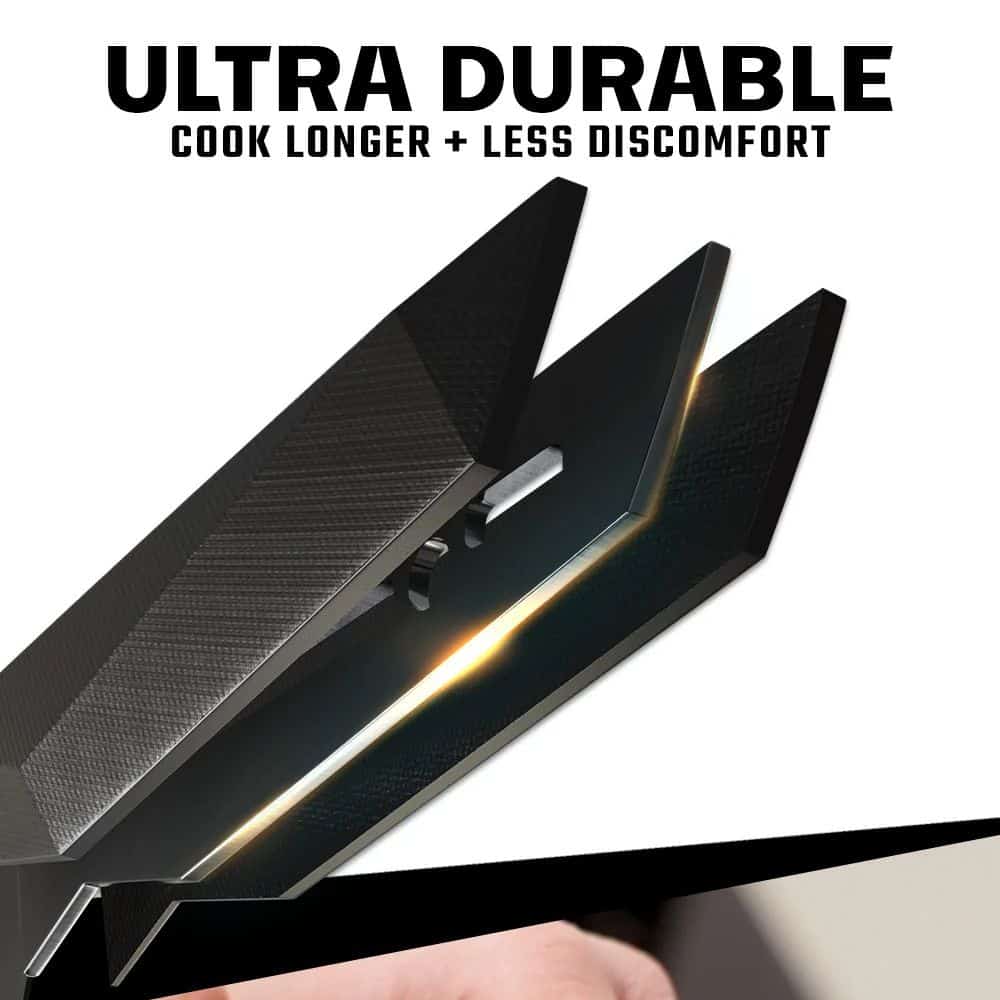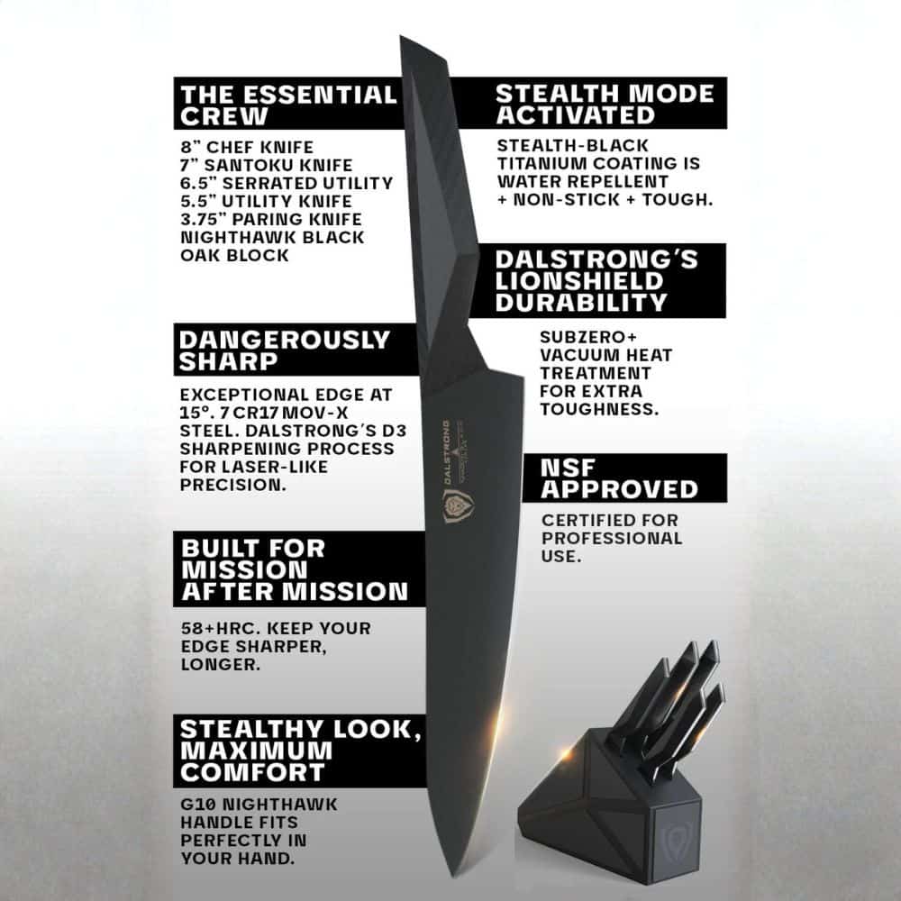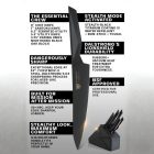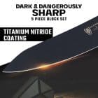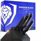 Turn your kitchen into a tactical prep station with a knife set that looks like it was inspired by a stealth fighter. The Shadow Black Series features an aggressive, aerodynamic design with unique handle geometry crafted from military-grade G10 resin that tucks snugly into your palm for a rock-solid grip. Each blade is forged from high-carbon steel, vacuum-treated for durability, and finished with a non-reflective black titanium-nitride coating that reduces friction and protects against corrosion.