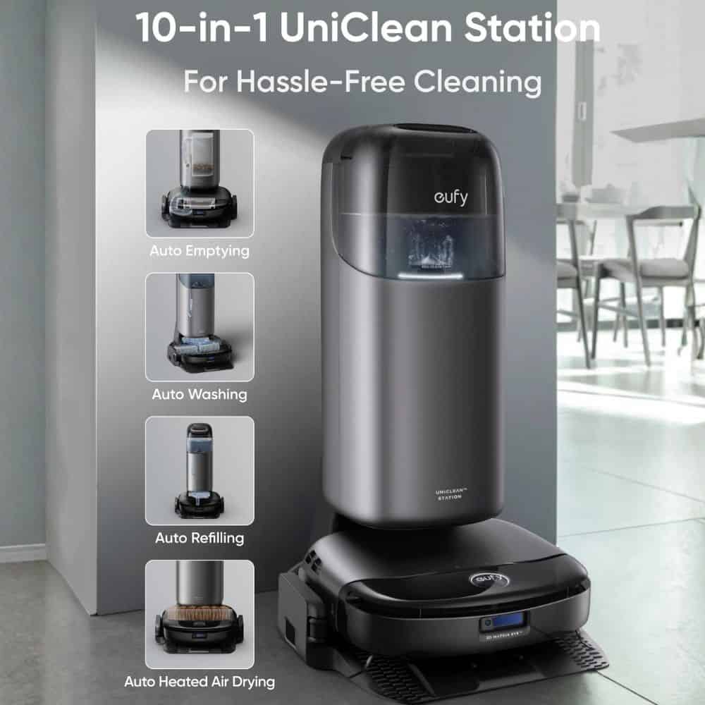 The 10-in-1 UniClean Station is the ultimate hands-free hub; it automatically empties the dustbin, refills the water tank, washes the mop, and dries it with 55C heated air to prevent odours. It even features Eco-Clean Ozone, which transforms tap water into a powerful sanitiser to kill 99.99% of bacteria. With a staggering 8,000 Pa suction power and 3D MatrixEye obstacle avoidance, it navigates your home with surgical precision, automatically lifting its mop by 12mm when it detects carpet to keep your rugs bone-dry. Its sleek, squared-off design ensures it hits every corner, making it the most autonomous cleaning partner you’ll ever own.