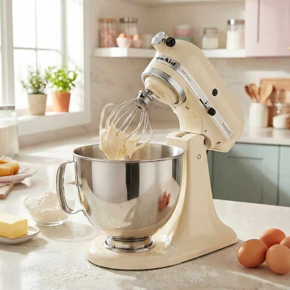 Bring a touch of timeless, farmhouse elegance to your kitchen with a design icon that has been the gold standard for home bakers for over a century. Finished in the soft, classic Almond Cream, this 4.8L Artisan mixer is built from solid die-cast metal, providing a heavy, stable base that won't budge even when kneading the toughest bread doughs. It utilizes the legendary original planetary action, where the beater rotates in one direction while whisking in the other, touching the bowl at 59 distinct points to ensure every scrap of flour is perfectly incorporated.
