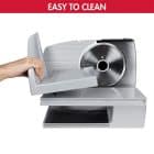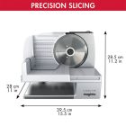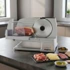The machine offers exceptional control via an adjustable thickness dial, allowing for precision from 1mm up to 28mm. Its extra-large tray can accommodate produce up to 20cm wide, while the 10° tilted carriage ensures food glides effortlessly towards the blade for a smooth, even cut. Safety is a priority, with a dual-button child safety switch and a storage lock included. Backed by a 3-year guarantee, it is a sturdy, professional-grade tool that brings a touch of "theatre" and absolute precision to your food presentation.