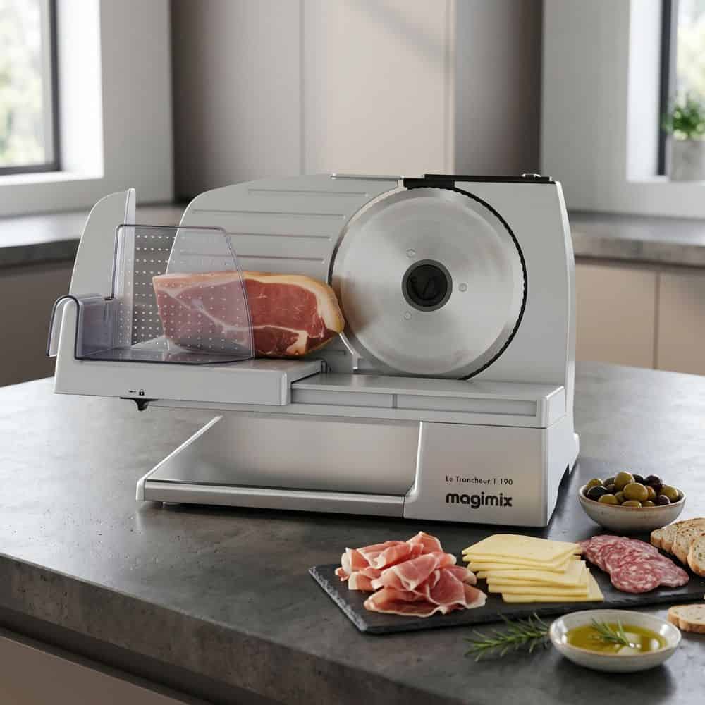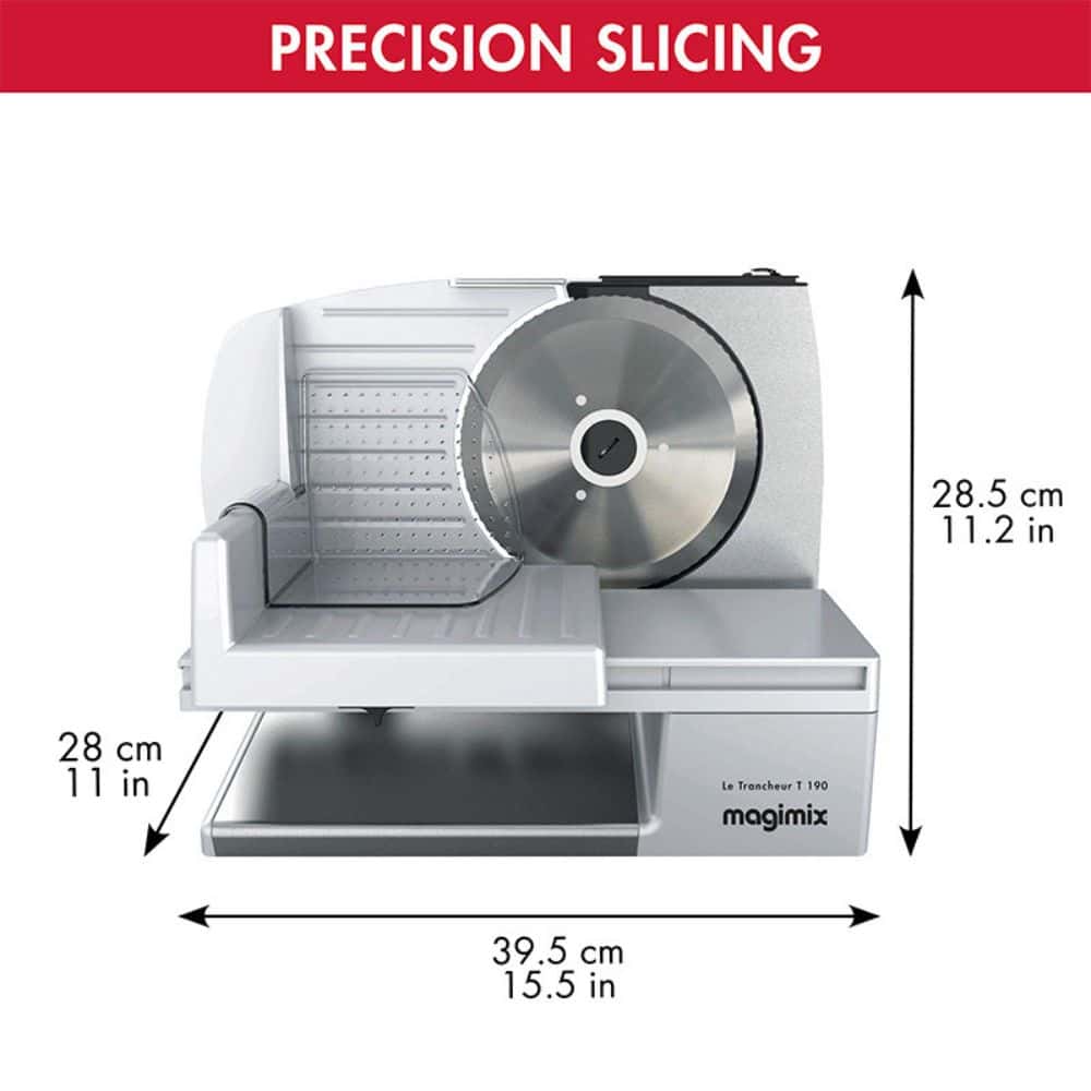 Transform your kitchen into a professional deli with a high-capacity slicer built to rigorous commercial standards. The Magimix T190 Metal Food Slicer features a powerful 150W induction motor and a 19cm multi-function serrated blade made from high-quality stainless steel. It is specifically designed for consistent, precision cutting of cooked meats, salami, hard cheeses, and artisanal loaves, allowing you to achieve that perfect “paper-thin” slice or a thick chunk of crusty bread.